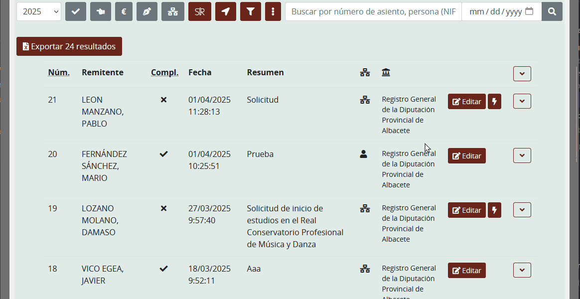 La columna «Procedencia» en los cambios de registro ahora mostrará un valor más aproximado a la procedencia real del cambio (SERES3 (presencial), WS (servicios web), SIR, SENIA, etc.).